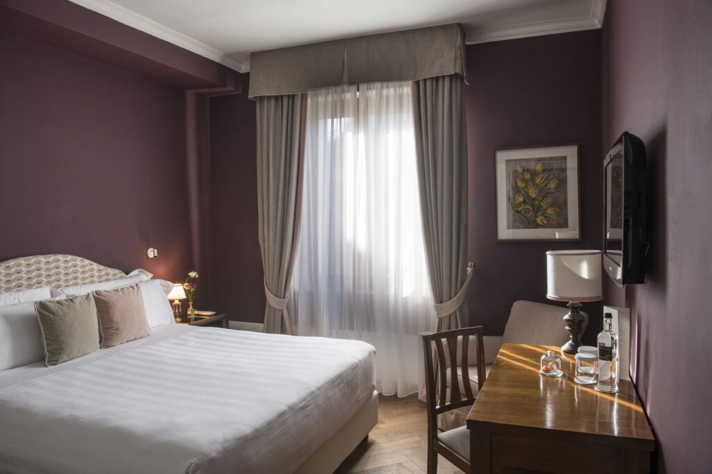 Sechs verschiedene Zimmertypen, sorgfältig eingerichtet mit antiken Möbeln und modernem Design, bieten Komfort und Raffinesse ohne Prunk. Der Luxus spiegelt sich in den Details, den edlen Materialien und der einzigartigen Atmosphäre wider.